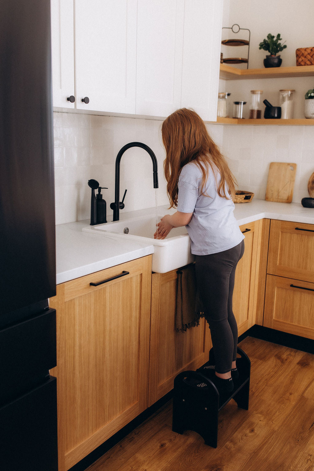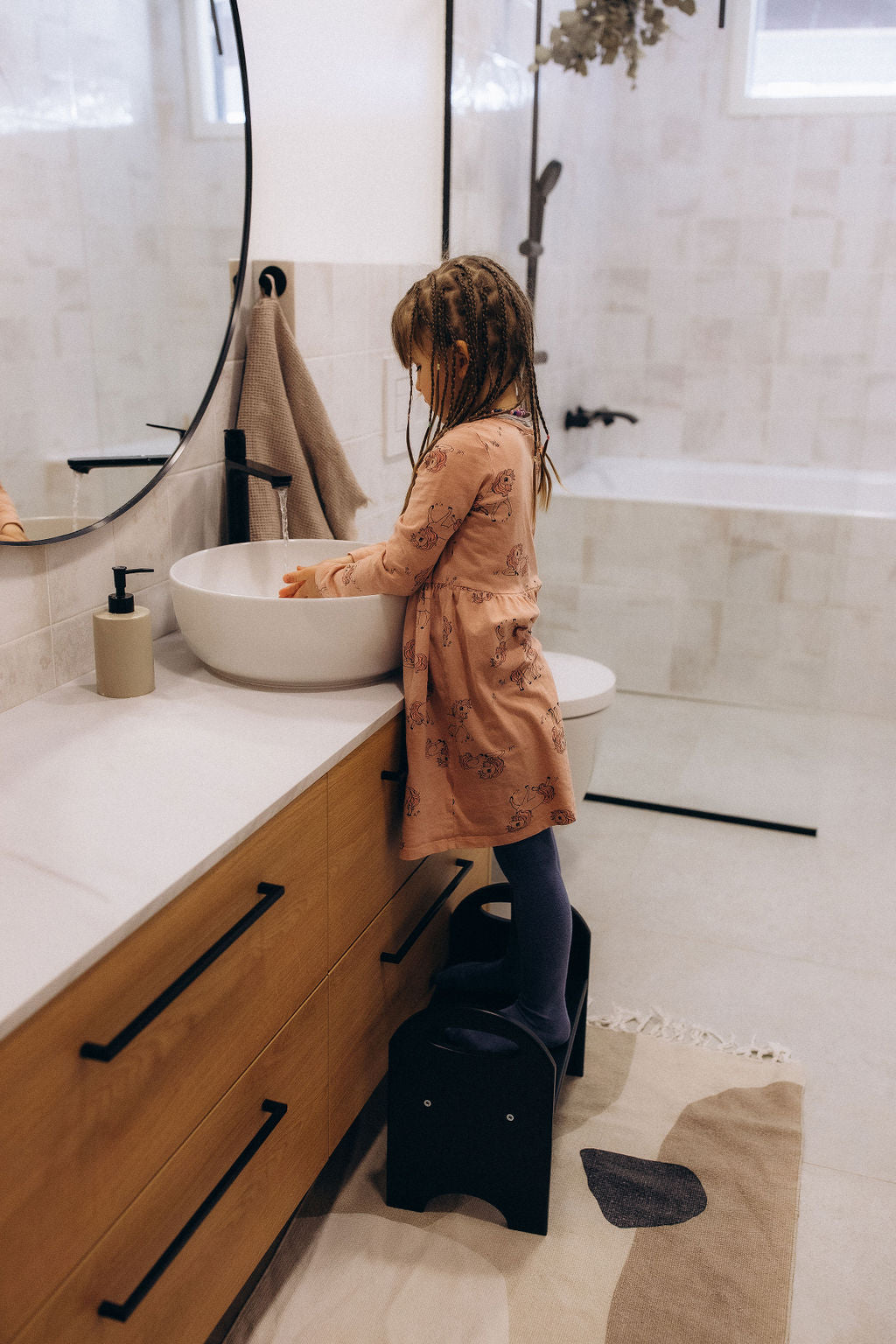 Trittbrett/Stuhl für Kinder, zwei in einem. Ein toller Helfer im Alltag für Kinder von 1 bis 4 Jahren. Ein Helfer im Alltag für das Kind kann als Trittbrett verwendet werden, um dem Kind zu helfen, auf die Toilette zu klettern und sich darauf zu setzen, zum Waschbecken zu gelangen, um sich die Zähne zu putzen, und den Eltern beim Zubereiten von Essen in der Küche zu helfen. Mithilfe dieses Trittbretts wird sich das Kind Ihnen ebenbürtig fühlen, weil es an verschiedenen Alltagsaktivitäten teilnehmen kann.
